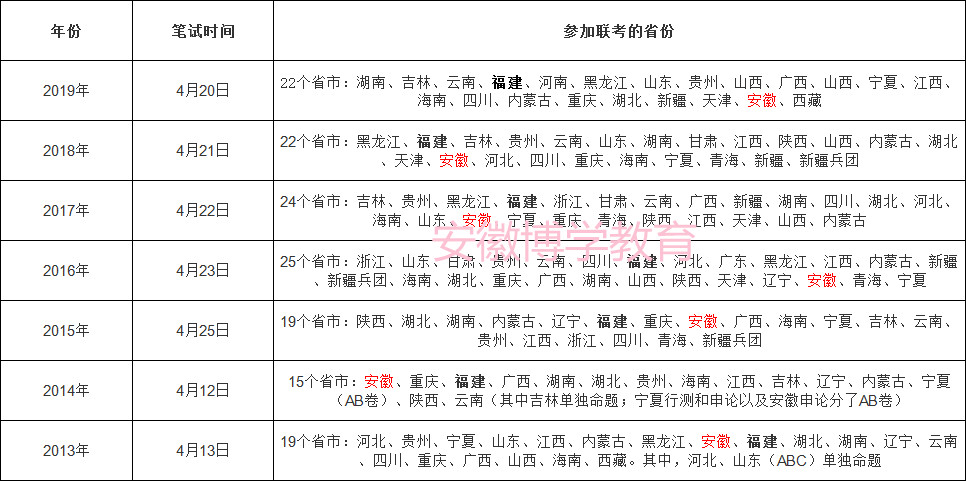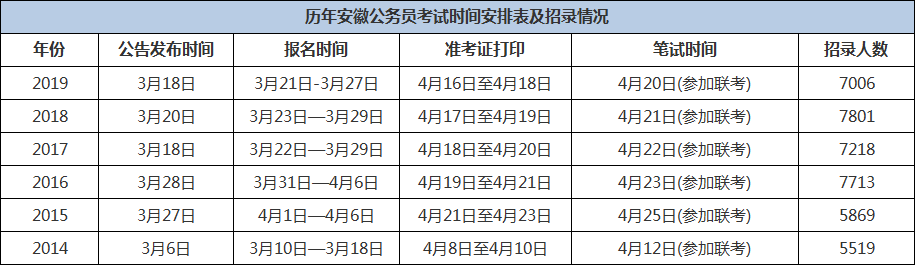 歷年安徽省公務(wù)員考試時(shí)間安排及招錄情況供大家參考(如下圖):