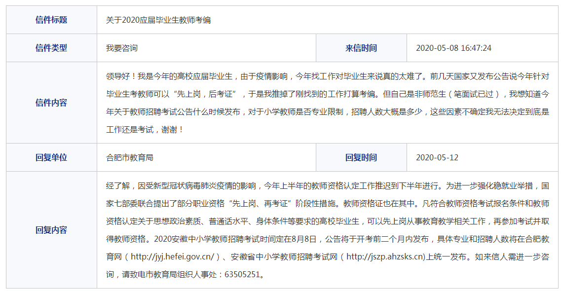 信件內(nèi)容:領(lǐng)導(dǎo)好!我是今年的高校應(yīng)屆畢業(yè)生,由于疫情影響,今年找工作對(duì)畢業(yè)生來說真的太難了。前幾天國(guó)家又發(fā)布公告說今年針對(duì)畢業(yè)生考教師可以“先上崗,后考證”,于是我推掉了剛找到的工作打算考編。但自己是非師范生(筆面試已過),我想知道今年關(guān)于教師招聘考試公告什么時(shí)候發(fā)布,對(duì)于小學(xué)教師是否專業(yè)限制,招聘人數(shù)大概是多少,這些因素不確定我無(wú)法決定到底是工作還是考試,謝謝!