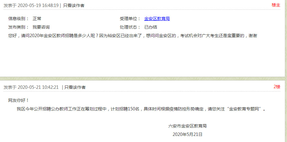 我區(qū)今年公開招聘公辦教師工作正在籌劃過程中,計(jì)劃招聘150名,具體時(shí)間根據(jù)疫情防控形勢確定,請您關(guān)注“金安教育專題網(wǎng)”。