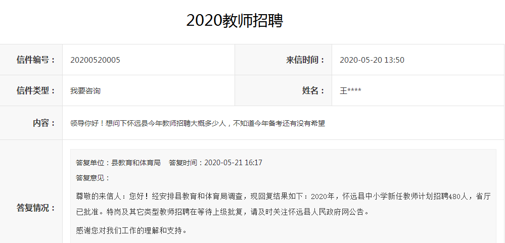 尊敬的來信人:您好!經安排縣教育和體育局調查,現(xiàn)回復結果如下:2020年,懷遠縣中小學新任教師計劃招聘480人,省廳已批準。特崗及其它類型教師招聘在等待上級批復,請及時關注懷遠縣人民政府網公告。