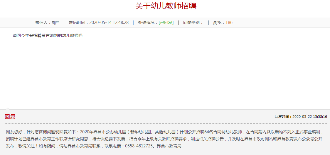 網(wǎng)友您好,針對您咨詢問題現(xiàn)回復(fù)如下:2020年界首市公辦幼兒園(新華幼兒園、實驗幼兒園)計劃公開招聘64名合同制幼兒教師,在合同期內(nèi)及以后均不列入正式事業(yè)編制,招聘計劃已經(jīng)界首市教育工作聯(lián)席會研究同意,待會議紀要下發(fā)后,結(jié)合今年上級有關(guān)教師招聘要求,制定相關(guān)招聘公告,并及時在界首市政府網(wǎng)站和界首教育發(fā)布公眾號公開發(fā)布,敬請關(guān)注!如有疑問,請與界首市教育局聯(lián)系,聯(lián)系電話:0558-4812725。界首市教育局