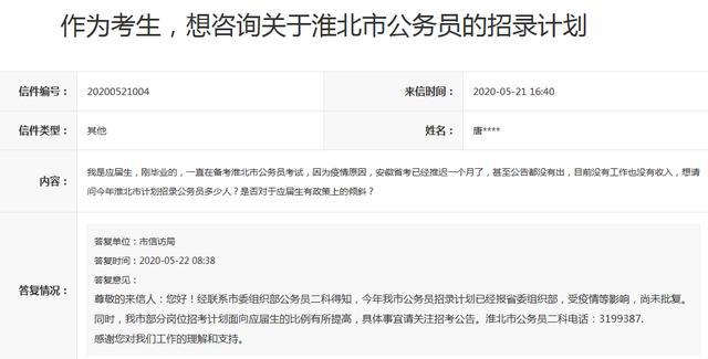 信件內(nèi)容:我是應(yīng)屆生,剛畢業(yè)的,一直在備考淮北市公務(wù)員考試,因?yàn)橐咔樵颍不帐】家呀?jīng)推遲一個月了,甚至公告都沒有出,目前沒有工作也沒有收入,想請問今年淮北市計(jì)劃招錄公務(wù)員多少人?是否對于應(yīng)屆生有政策上的傾斜?