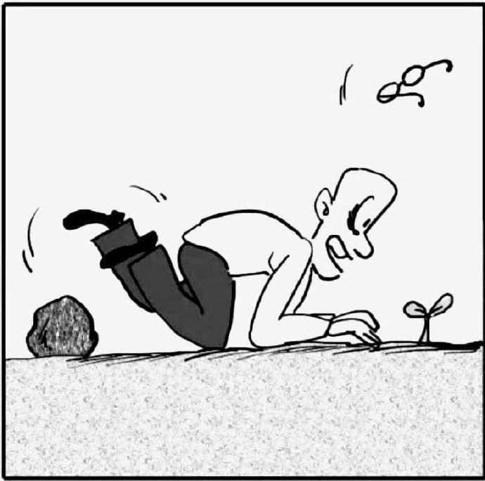 2、漫畫題:一個人被一塊石頭絆倒,眼鏡跌飛,眼睛緊盯著一個小樹苗。(如下圖)